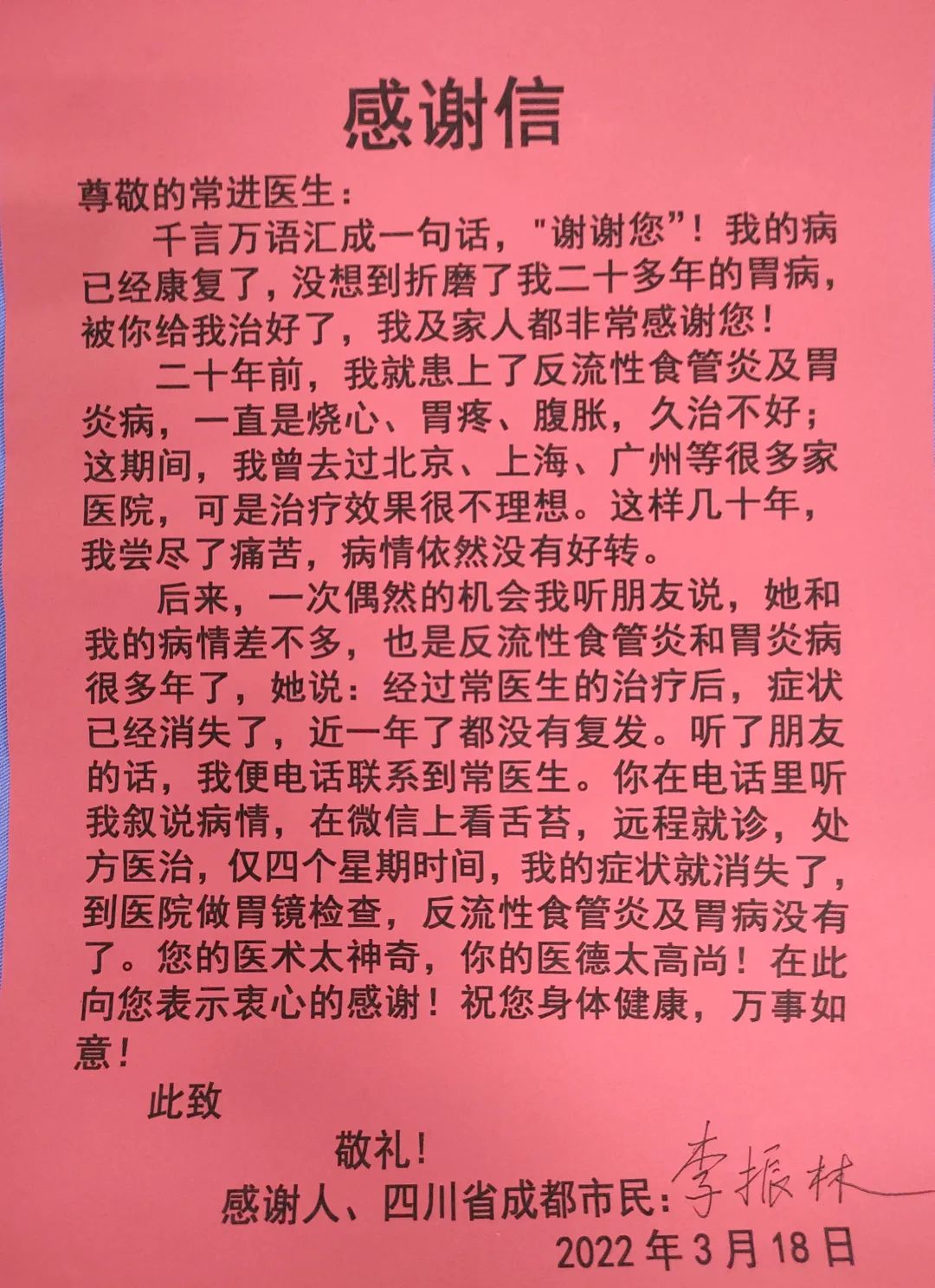 患者李振林先生飽受反流性食管炎及胃炎病二十余年的困擾,曾去過多地尋醫(yī)問診,但療效一直很不理想,經(jīng)朋友推薦聯(lián)系到常主任,經(jīng)遠(yuǎn)程就診用藥,僅用了四個(gè)星期病癥完全消失且再無復(fù)發(fā)。李先生非常感激,特意訂制了“醫(yī)術(shù)精湛手到病除 醫(yī)德高尚名揚(yáng)天下”的錦旗,向常主任表達(dá)了衷心的感謝。